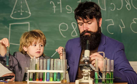 Teacher bearded man father and child test tubes. Chemical experiment. Study chemistry together. Following father in everything. My father is scientist. Personal example. Knowledge day. Genius minds