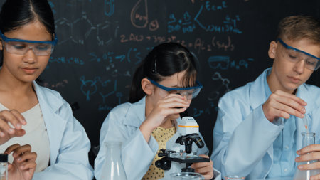 students doing science experiments with microscope in lab. school kids scientist studying science. happy children teacher. back to school. Little kids learning chemistry in school laboratory