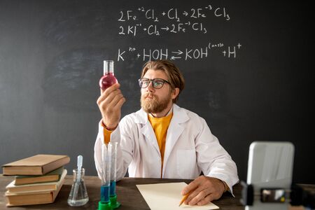 Bearded teacher of chemistry looking at tube with pink liquid substance