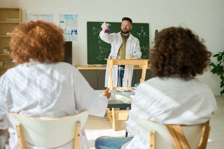 Confident teacher of chemistry in labcoat showing students tube with liquid substance obtained by mixing two various fluids