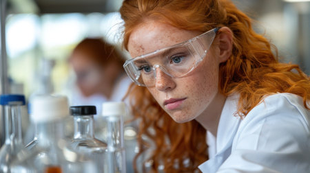 A young woman, wearing safety glasses, intently observes scientific experiments in a laboratory.