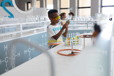 African american elementary schoolboy looking at chemical in test tube during chemistry class. unaltered, education, learning, laboratory, stem, scientific experiment, protection and school concept.