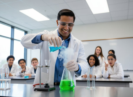 Confident teacher conducting an experiment in front of students in a classroom. Man explaining children sense of analysis. Generative AI