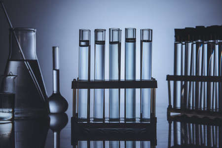 test tubes with lab glassware on the table in laboratory background, research and Scientific concept