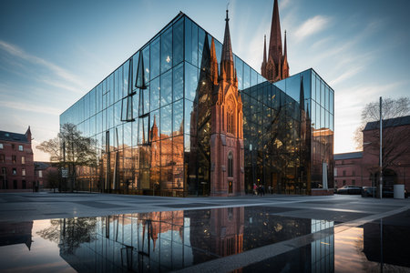 An Contrasting Style of Ancient Cathedral Reflection in Modern Glass Building