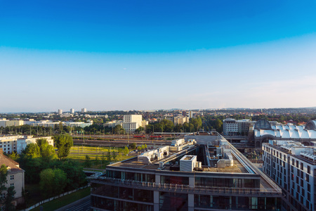 DRESDEN, GERMANY - MAY 2, 2018. Panoramic aerial shot of the city involving historic and modern districts