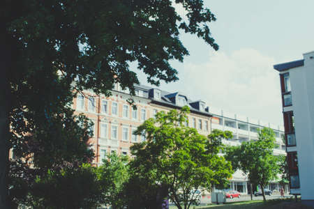 RIESA/GERMANY - July 23/2018: Photo of cityscape with houses, asphalt road and trees on a sunny day