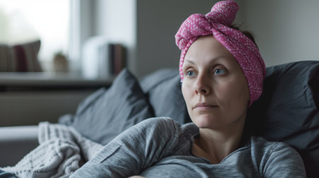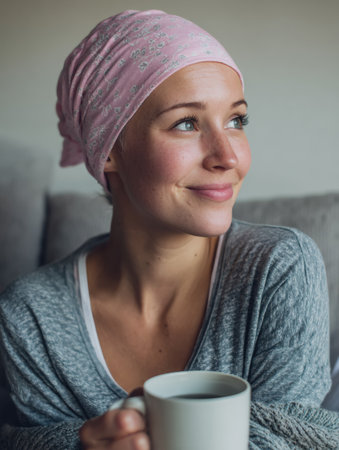 A woman with a pink headscarf enjoys a warm drink while reflecting on her self-care journey during cancer treatment in a comfortable, serene environment.