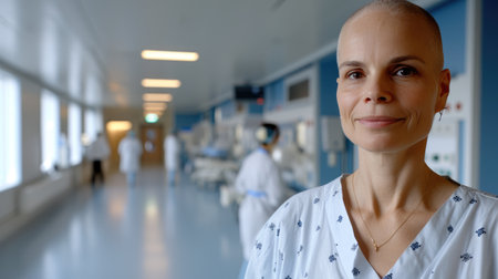 A cheerful woman with a shaved head smiles in a hospital setting, wearing a gown.