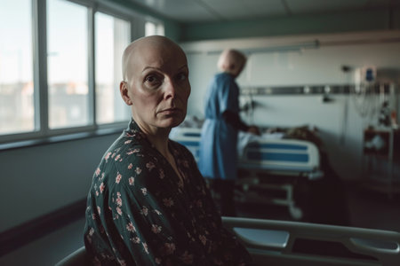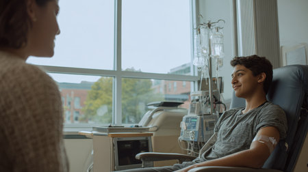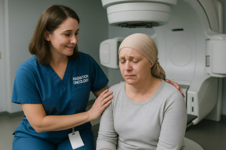 Healthcare professional supporting cancer patient undergoing radiation therapy, providing emotional support and medical care in oncology department
