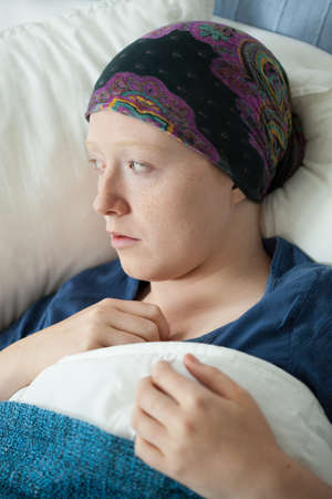 Woman in bed suffering from cancer. Thoughtful woman battling with tumor. Patient with headscarf recovery in hospital on bed.