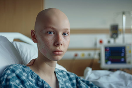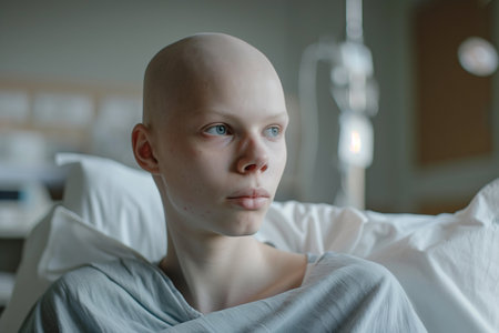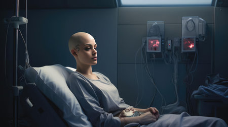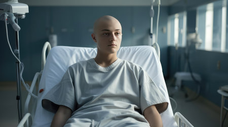 Young woman in hospital bed suffering from breast cancer receiving treatment
