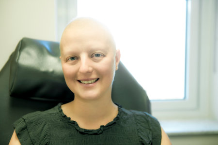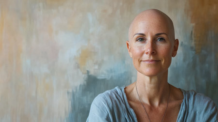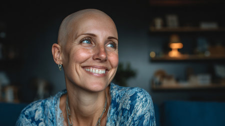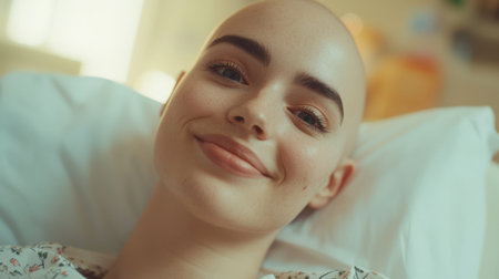 Portrait of a bald woman, her expression calm and peaceful, her smile revealing inner strength as she faces her cancer journey