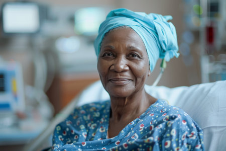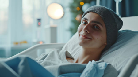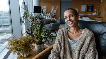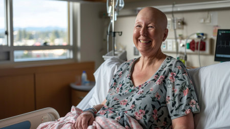 A smiling woman exudes warmth and positivity while sitting in a hospital room, symbolizing hope and resilience during challenging times.