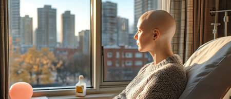 A woman with cancer gazes out the hospital window, feeling hopeful as soft light fills the room and illuminates the city outside.