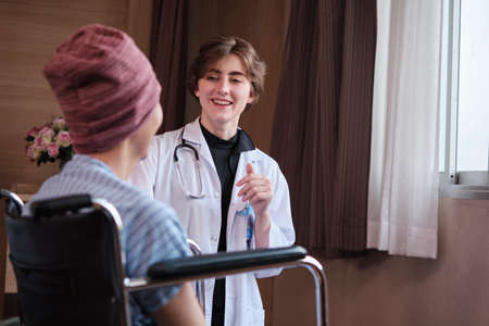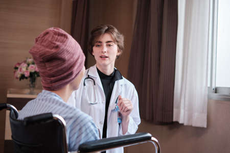 Uniformed young Caucasian female therapy doctor encouraging wheelchair male patient at window to support and motivate recovery, cancer illness after chemo medical treatment in hospital inpatient room.