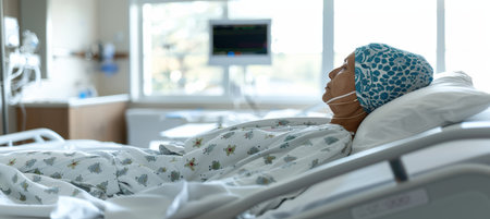 An AI generated illustration of a cheerful woman with a headscarf on hospital bed