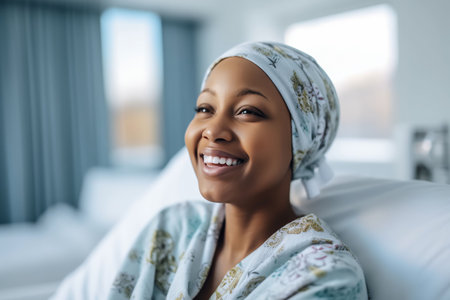 Hopeful Cancer Survivor in Headscarf Smiling Brightly, Embracing Life and Inspiring Wellness Journey