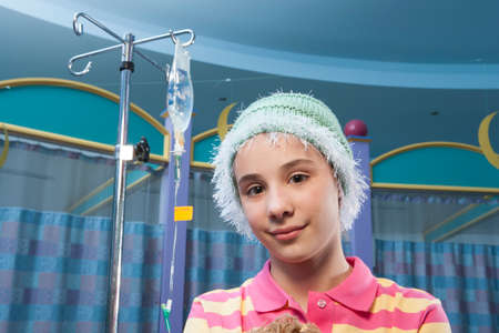 Photo of pretty smiling cancer girl connceted to chemotherapy