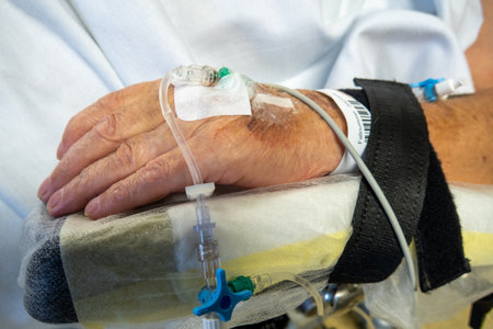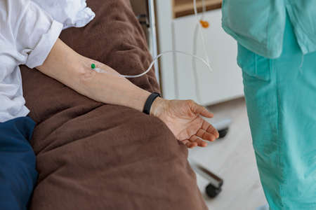 Hand with IV catheter in ward bed closeup. Aged patient undergo clinic treatment. Unrecognized senior person arm with intravenous therapy lying in operating room. Healthcare medical system concept.