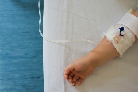 Hand of patient in serious condition is given a medicine through a dropper (healthcare background with an intravenous system)