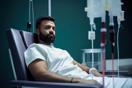 Overweight man sitting in a chair with a dropper, equipment in the foreground, patient in hospital.