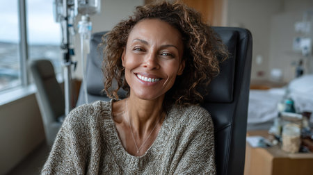 A joyful woman sits in a hospital chair, showcasing a bright smile that exudes positivity and hope while illuminated by soft, natural light.