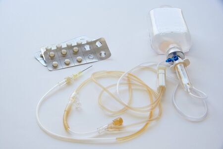 Concept of antibiotic medication in tablets and used bag of intravenous fluid injection with needle on white background