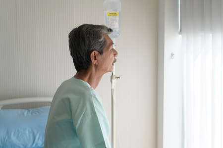 Portrait of senior patient lying on bed in hospital, healthcare and medical concept