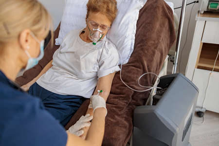Nurse putting a drip in the arm of her patient in modern medical clinic
