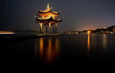 Pavilion on the lake at night in Hangzhou, China