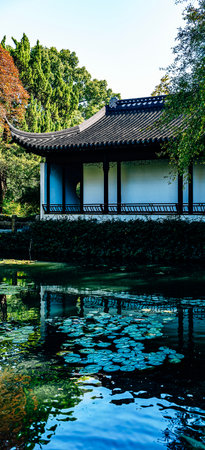 Traditional Chinese Pavilion on Water with Reflective Lake and Classic Architecture