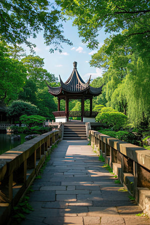 Beautiful Chinese garden in Suzhou, Jiangxi, China.