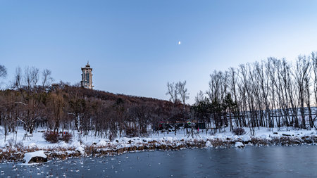 Scenery of Jingyuetan National Forest Park in Changchun, China after snow