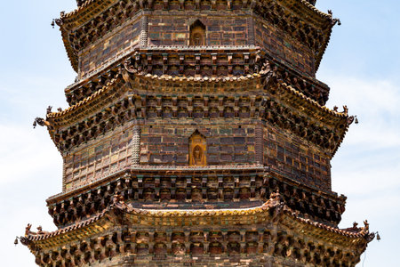 The Iron Pagoda of Kaifeng, Henan, China. Built in 1069 and 57m high, its glazed surface of Iron color features 1600 intricate and richly detailed carvings. Kaifeng is an ancient capital of China