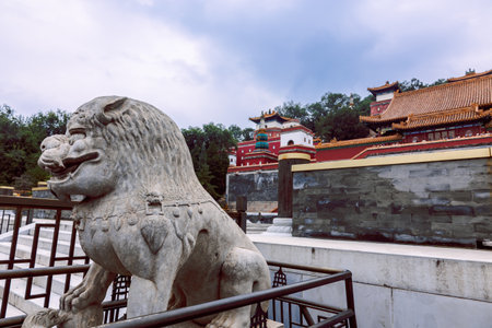 Beijing, China - October 5, 2025: Stone guardian lion sculpture in foreground with imperial Summer Palace buildings in historic palace complex surrounded by classic architecture and landscaped grounds