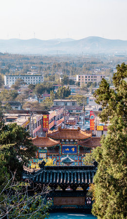 Aerial view of the temples on Wutai Mountain in the morning, Shanxi Province, China
