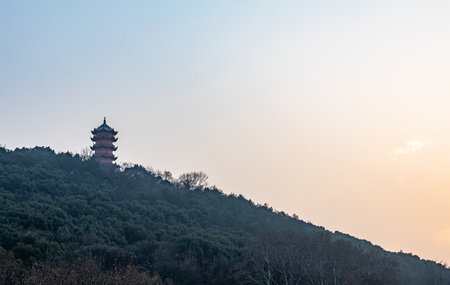 Pagoda on the top of the mountain at sunset in China