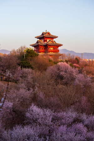 Beijing Garden Expo Park Wenchang Pavilion spring mountain flowers scenery