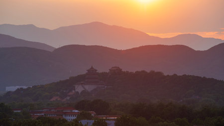 Mountain ridges bathed in sunset glow, with traditional Chinese architecture of Beijing's Summer Palace