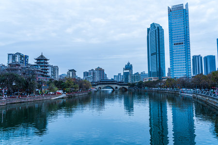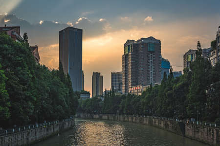 Chengdu, China - July 2019 : Jin River flowing through Chengdu city at dusk, Sichuan Province