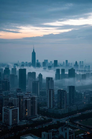 A captivating aerial view of a bustling city skyline shrouded in fog. The busy road below is filled with cars, while modern skyscrapers rise in the background, creating an urban landscape.