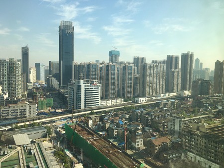 Wuhan Hubei China, 14 September 2017: Aerial view of Hankou district in Wuhan city with elevated subway railroad and highway under construction between buildings