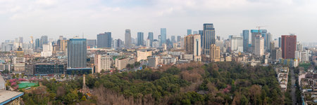 Chengdu, Sichuan province, China - Aug 11, 2019 - Chengdu city skyline aerial view in late afternoon with Jinjiang river.