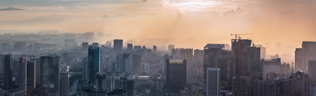 Chengdu, Sichuan province, China - Aug 19, 2020 : Chengdu backlight skyline panorama aerial view with clouds on the city