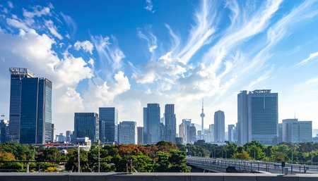 amazing a city skyline with a a cityscape featuring a towering skyscraper a bustling street and a serene river flowing through it png