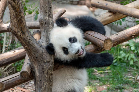 Giant Panda (Ailuropoda melanoleuca) climbing a tree at the Giant Panda Breeding Research Base in Chengdu, China
