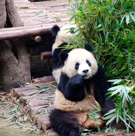 Giant panda sitting outdoor eating lunch