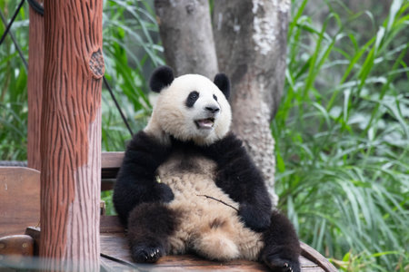 Giant panda sitting on wood and looking far ahead, Chengdu, Sichuan province, China