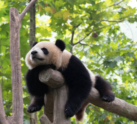 Giant panda sleeping in a tree, Chengdu, Sichuan Province, China